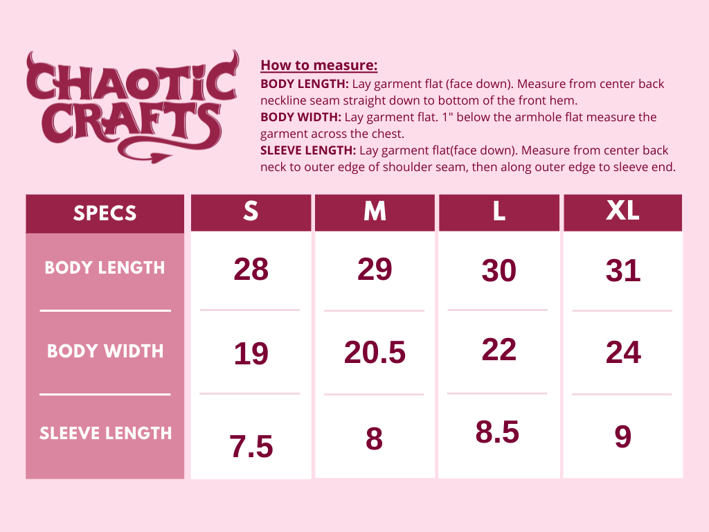 Check photos for shirts sizing. Specifications listed are in inches. More sizes will be added soon! Available in limited quantity until the next restock.