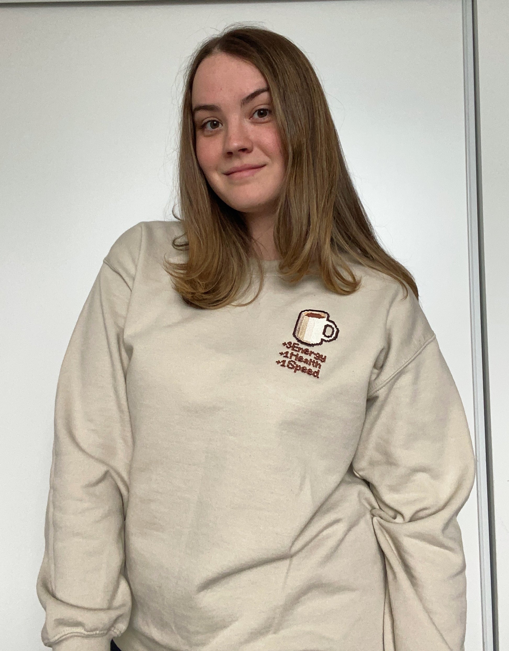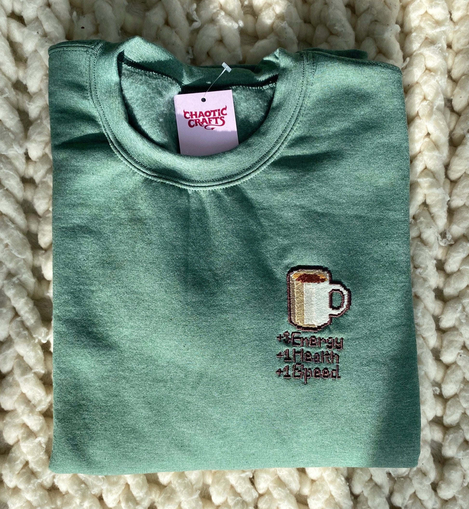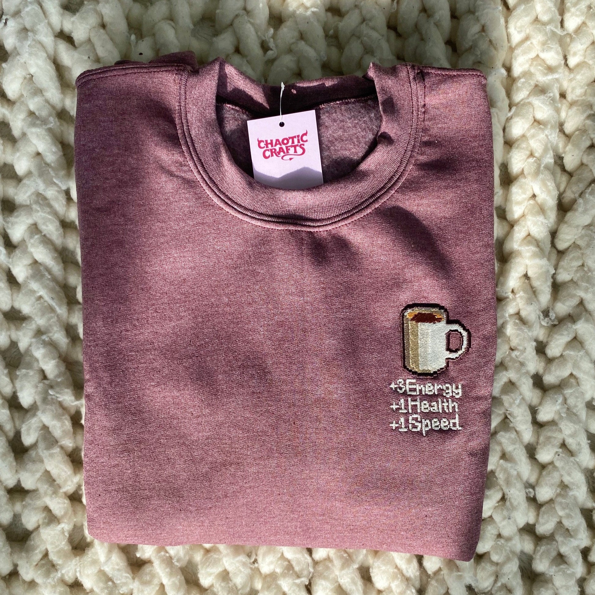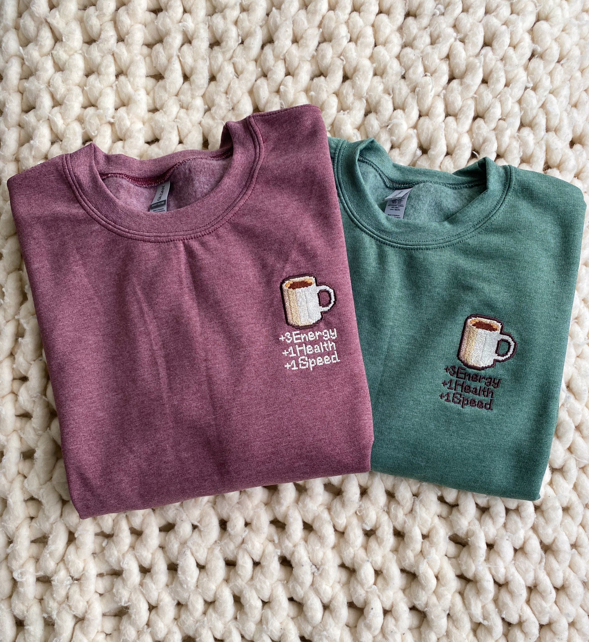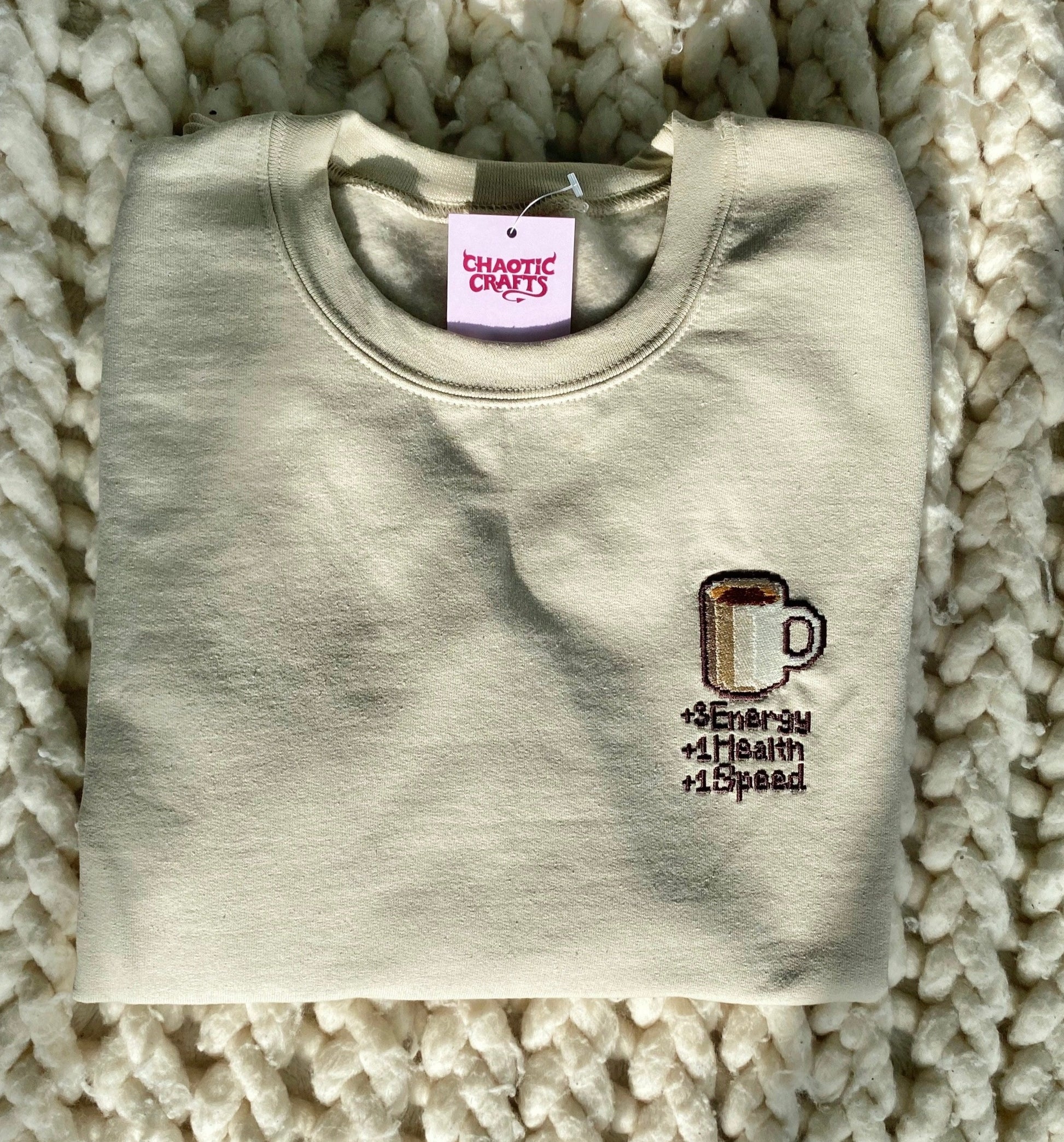 Experience ultimate coziness with Coffee Stats Crewneck Sweaters. These sweaters feature pixel art embroidered on cozy crewneck sweaters. Perfect for the late-night gamer who loves coffee, and farming. This sweater will have you eager to hibernate in comfort and style. So grab your favorite mug and cozy up in your Coffee Stats Crewneck Sweater!