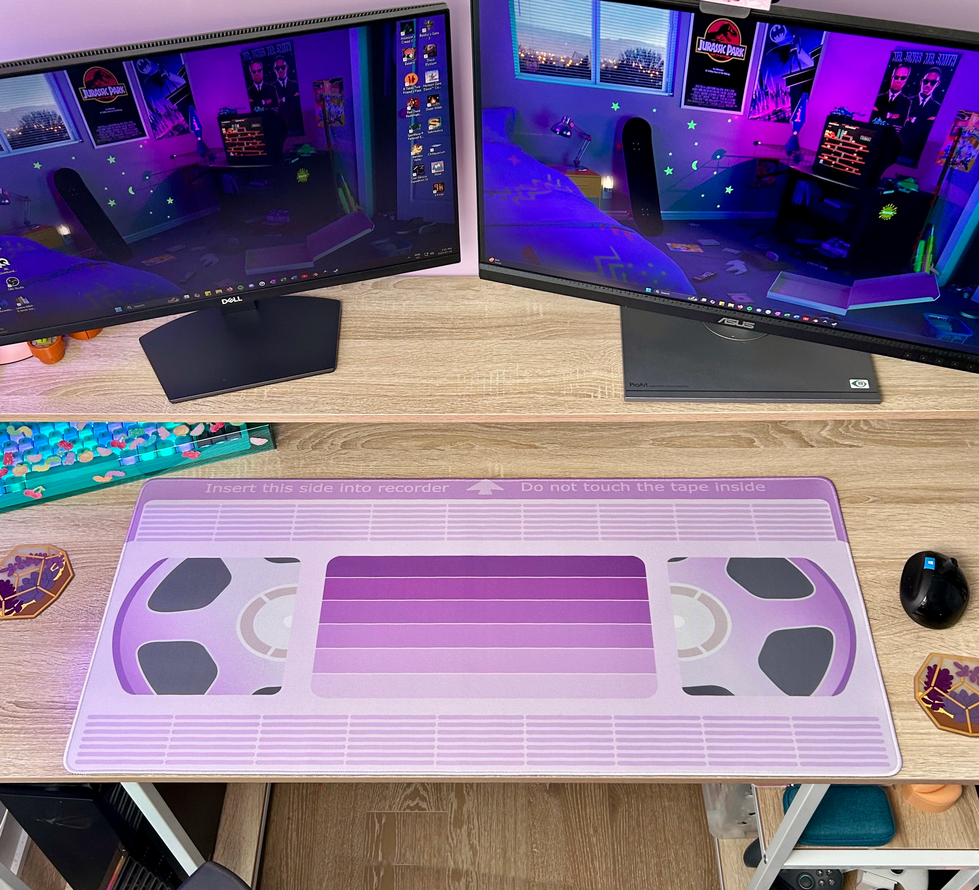 Bring a splash of '90s nostalgia to your workspace with the VHS Desk Mats. Available in four vibrant colors—lavender (Lavender LEDs), original black/grey (Synth Slate), dark purple (Neon Midnight) and green (Miami Mint)—each mat adds a retro vibe while protecting your desk. Perfect for anyone who loves a fun throwback to brighten up their setup!