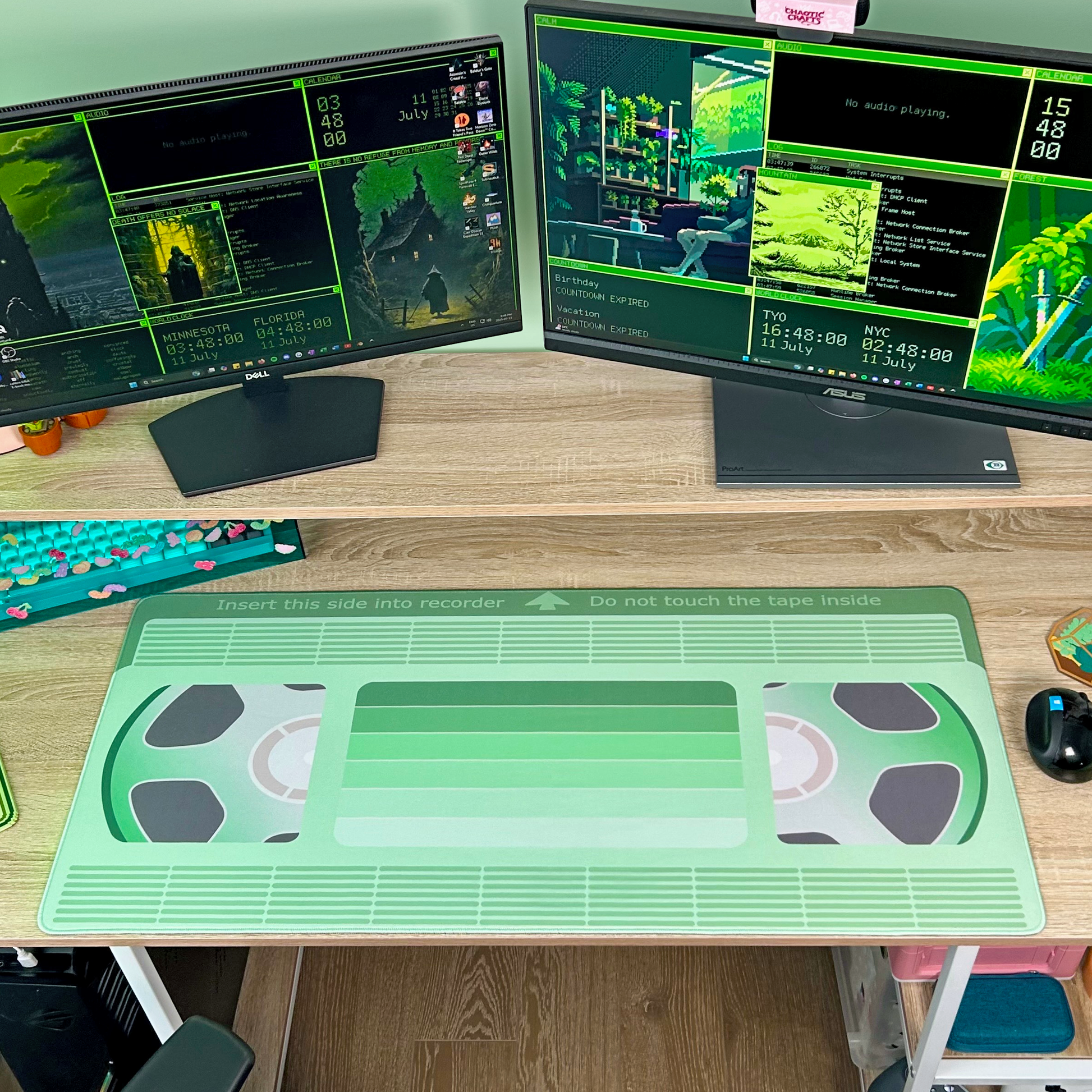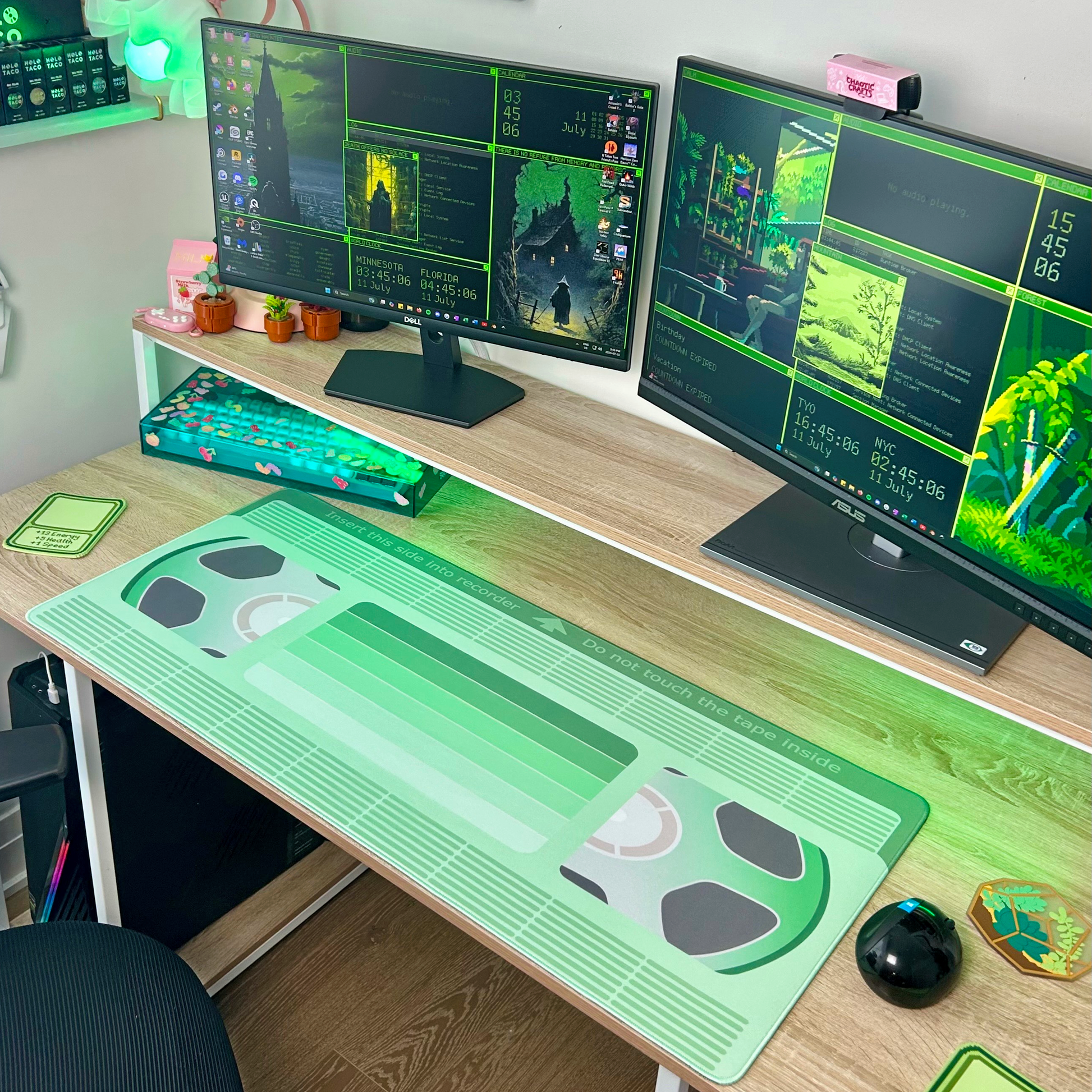 Bring a splash of '90s nostalgia to your workspace with the Miami Mint VHS Desk Mat. Available in four vibrant colors—green (Miami Mint), original black/grey (Synth Slate), dark purple (Neon Midnight), and lavender (Lavender LEDs)—each mat adds a retro vibe while protecting your desk. Perfect for anyone who loves a fun throwback to brighten up their setup!