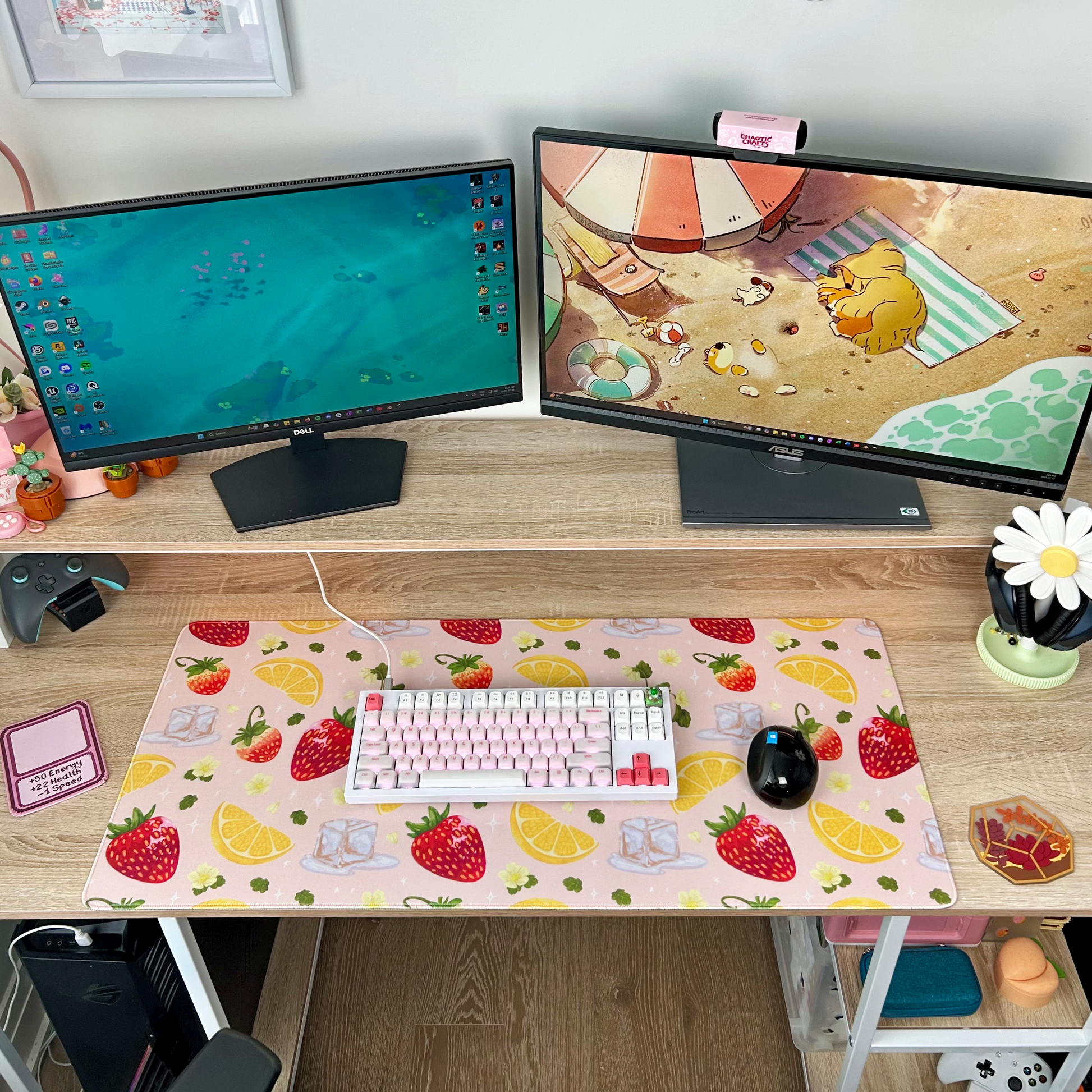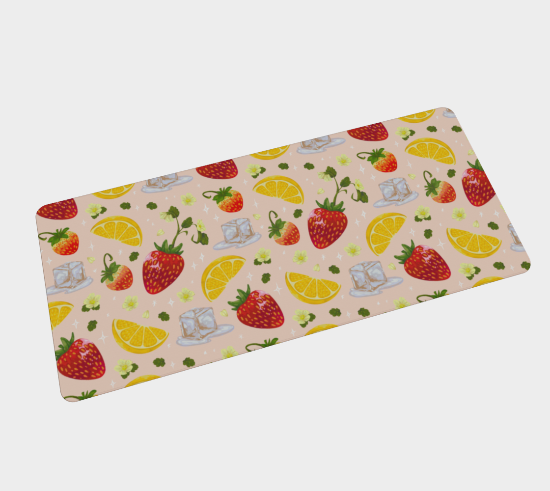 Feel refreshed with this sip of summer! Transform your workspace with the Strawberry Lemonade Desk Mat. Featuring a strawberry, lemon, ice cube, and flower pattern on a blush pink background. The print on demand desk mats feature a cushioned super-smooth printed front and rubberized non-slip back. Protect your workspace and personalize it with a desk mat that suits your style!