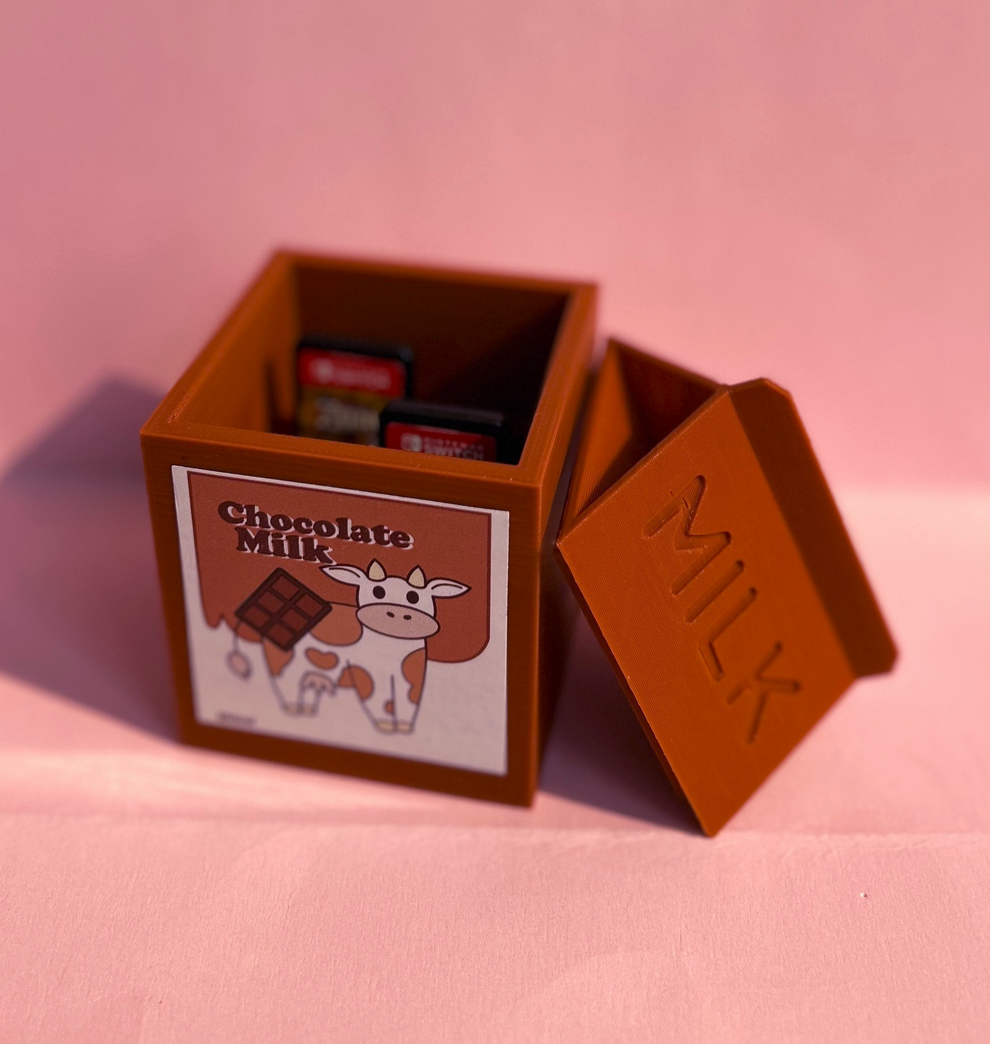 A cute little strawberry, chocolate, banana, or peach milk carton container to collect all your favourite switch games. The milk carton comes with built in switch game storage to store 8 of your games in a cute safe place. A great upgrade for your cozy gaming setup.