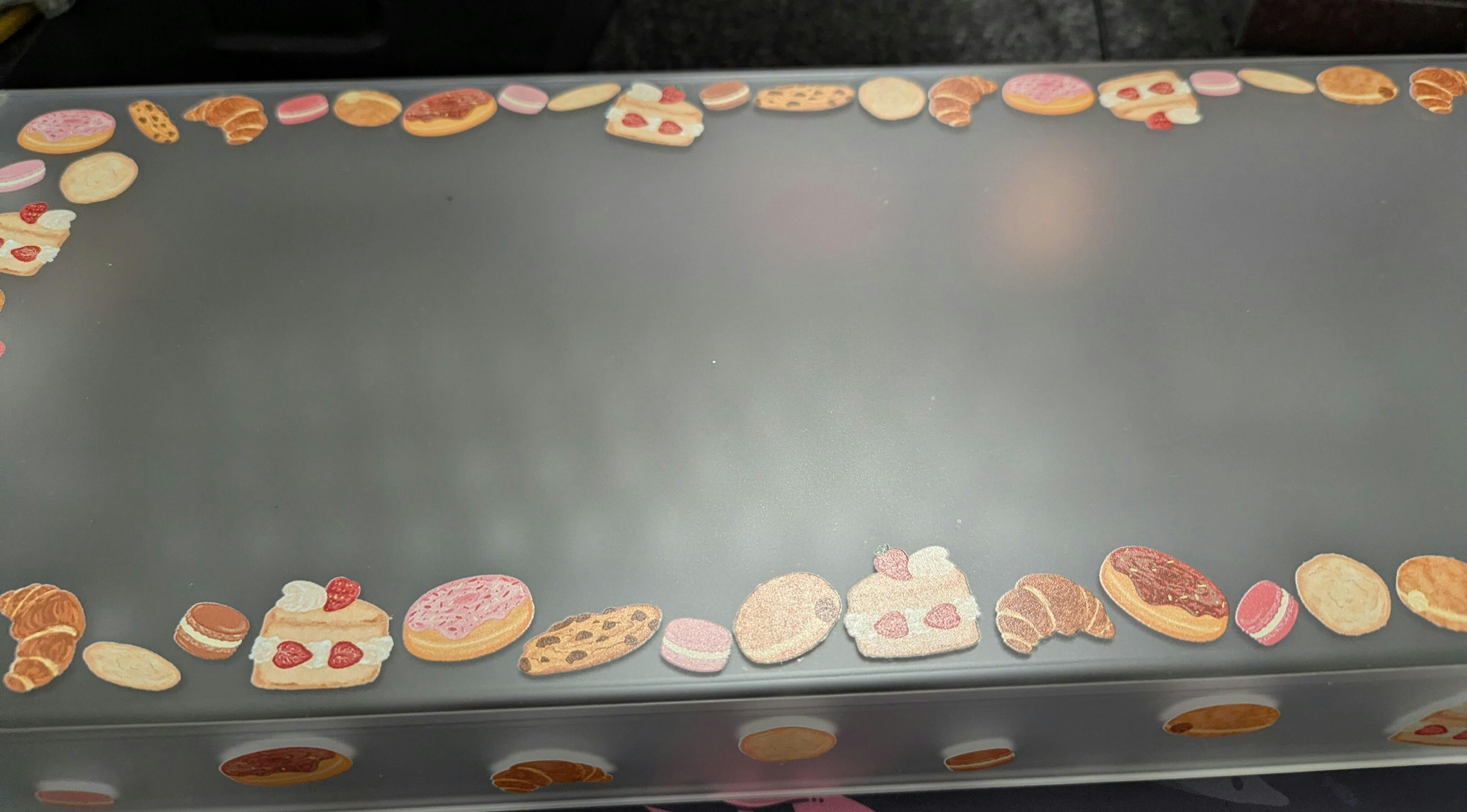 The Baked Treats Acrylic Keyboard Cover is made with a semi-translucent matte acrylic with a screen printed baked treats design (featuring croissants, donuts, macarons, cookies & cake) along the borders of the top and side faces of the cover. The cover is 5 sided to protect your keyboard from crumbs and critters with a 3cm wide opening along the back for cables.